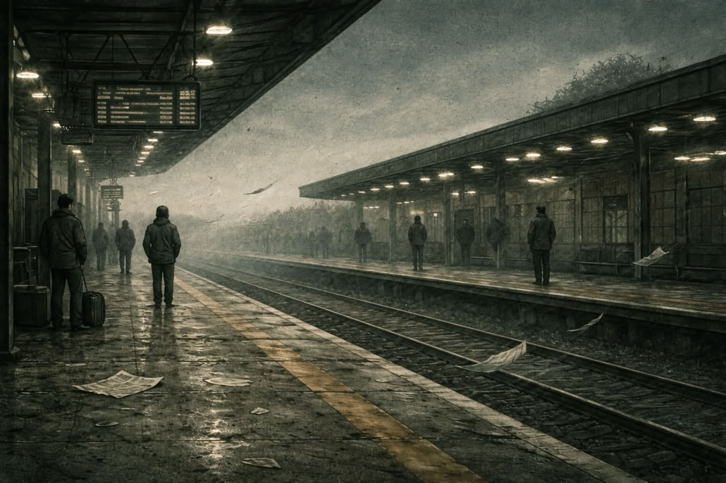 ‍Langs de rand van het perron stonden mensen verspreid. Schoenen schoven over natte tegels. Iemand kuchte, kort en zonder schaamte. Een telefoon trilde dof in een jaszak en werd meteen weer het zwijgen opgelegd. Op de borden boven hen wisselden cijfers van plaats. Bestemmingen schoven op, verdwenen, kwamen terug in een andere volgorde, alsof er elders iets gebeurde waar hij geen deel van uitmaakte.