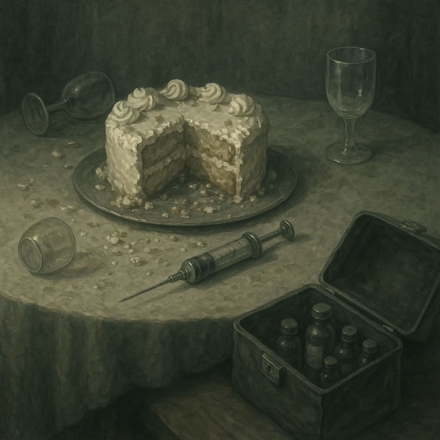 ‘Wilt u een stukje, dokter? Zelf gebakken.’ De vrouw waggelt richting de tafel. Ze draagt een blouse met vetvlekken op de buik, haar armen glanzen van het zweet. Een vrouw die haar hele leven geprobeerd heeft het juiste te doen, met bloem en suiker, met zwijgen en veel glazen wijn. Nu schuifelt ze met een taart. Geen woorden meer. Alleen nog glazuur en opgeklopte room.